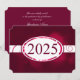 Diseños florales alrededor del botón sobre una cinta blanca que tiene diseños florales. Borgoña de fondo nublado. La parte trasera de la tarjeta tiene un fondo borgoñoso con letras blancas para los anuncios de graduación.