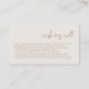 Esta tarjeta de cerramiento de pozo de los deseos presenta una fuente manuscrita con estilo y un diseño minimalista moderno con una combinación de colores bohemios de terracota y beige. Edite fácilmente para agregar la información de su registro y sitio web en la parte inferior. Haga clic en 'personalizar más' para cambiar los colores para que coincidan con su evento.