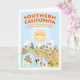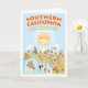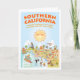 Esta tarjeta de saludo es un espectacular personalizado del sur de California - Los Ángeles, Anaheim, Long Beach, San Diego. Esta encantadora escena lo tiene todo - un surfista cuelga diez mientras una sirena se sienta en una roca, una ballena asesina salta del agua, una pareja de playa muscular flex para impresionar, animales del zoológico esperan a los turistas, un toro golpea en un torero, y mucho más...