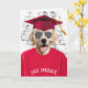 Perro recuperador de oro con camiseta roja, gafas de sol aviador y gorra de graduación roja por felicitaciones de graduación.