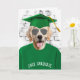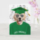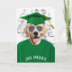 Perro recuperador de oro con camiseta verde, gafas de sol aviador y gorra de graduación verde para felicitaciones de graduación.
