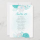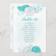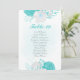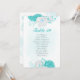flores románticas turquesas y blancas sobre una bonita carta de cartas con números de asientos en la mesa de corona. Los detalles del purpurina se simulan.
