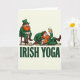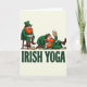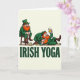 Esta tarjeta muestra a tres duendes en un fondo cremoso, dispuestos como en una divertida pose de “yoga” después de una larga noche del Día de San Patricio 💚. A la izquierda, uno se sienta en un taburete rústico con una expresión cansada pero divertida, como si estuviera vigilando a sus amigos con cariño. A sus pies, una pequeña jarra de cerveza descansa cerca de sus botas, lo que sugiere que la fiesta ha estado en marcha durante un tiempo ☘️. En el centro, un duende yace casi plano en profunda relajación mientras su compañero se apoya en un codo, inclinándose hacia adelante mientras levanta una jarra espumosa sobre su cabeza. Sus trajes esmeralda y sus barbas naranjas brillantes resaltan, y la jarra levantada muestra cerveza dorada contra la ropa verde oscuro. Algunas botellas vacías están esparcidas alrededor de ellos en el suelo
