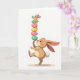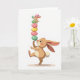 Esta tarjeta presenta dos personajes parecidos a conejos que equilibran una alta pila de huevos moteados sobre un fondo blanco brillante 🐰. La figura más grande es marrón claro con orejas largas y mejillas sonrosadas, se mantiene en un pie con un dedo hacia arriba sosteniendo cinco huevos. Sus ojos se inclinan hacia arriba con una mirada enfocada y afectuosa, como si estuviera animando en silencio a un amigo cercano. Un compañero más pequeño, posado en la parte superior y con un gorro a rayas, se inclina hacia adelante con una sonrisa orgullosa mientras coloca un sexto huevo más pequeño en su lugar 🐇. Los huevos están coloreados en tonos suaves de primavera como verde menta, rosa suave y amarillo soleado, cada uno salpicado con pequeñas manchas que añaden textura. Un breve saludo de Pascua aparece cerca de la parte superior en un color pastel suave, con una línea de texto más pequeña colocada debajo en un tono más claro. Una