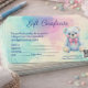 Esta encantadora tarjeta de certificado de regalo de osito de peluche pastel es perfecta para planificadores de fiestas infantiles, organizadores de eventos y empresas que ofrecen experiencias de fiestas infantiles. El suave fondo de acuarela en tonos pastel soñadores crea una atmósfera alegre y mágica, mientras que la adorable ilustración del osito de peluche añade un toque juguetón y amigable. Diseñada para promocionar servicios de fiestas infantiles, este certificado personalizable incluye espacio para los detalles del destinatario, fecha de vencimiento y un código QR para acceso rápido a la reserva o información del evento. Ideal para fiestas de cumpleaños, servicios de entretenimiento infantil, empresas de planificación de fiestas y eventos mágicos para niños.