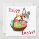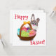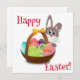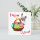 Un conejo de Pascua mira desde detrás de una canasta llena de Huevos de Pascua. Uno de los huevos tiene un nombre personal que es fácil de editar o quitar. El tipo de letra, los colores y el color de la propia tarjeta también es fácil de cambiar.