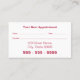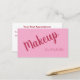 Esta tarjeta de cita de artistas de maquillaje rosa Magenta es fácil de personalizar en línea antes de realizar pedidos. En la parte delantera de la tarjeta aparece la palabra "maquillaje" en un elegante guion giratorio en un color magenta de cereza, sobre un fondo rosa claro de bonito junto con la personalización del nombre del maquillador. En la parte posterior de la tarjeta se muestra el texto en color de magenta cerezo y también el espacio para que los detalles de la cita se escriban a mano cuando la tarjeta esté en uso. Hay personalización para la dirección de salón (u otra redacción de su elección, por ejemplo, áreas cubiertas si usted es un negocio basado en el móvil) y también para el número de teléfono de negocios.