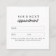 Una hermosa manera de reservar la próxima cita con su tarjeta profesional de cita en blanco negro. La tarjeta de cita del cliente se puede personalizar según el texto, el código QR, el identificador de redes sociales y los detalles del negocio.