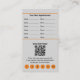 Presentamos la Tarjeta de Lealtad y Cita de Retrato de Edgy Gray Black & Naranja - su solución todo en uno para pequeños negocios de servicios como peluquerías, terapeutas de masaje, esteticistas o incluso un planificador financiero o entrenador de vida. Esta tarjeta de formato de retrato exuda sofisticación con un logotipo de personalizable, su nombre, profesión y negocios con información de contacto y dirección en el frente. Voltea hacia atrás para descubrir seis espacios de cita naranja, cuidadosamente arreglados, con fechas y horarios. Mientras que a lo largo del borde inferior hay marcas redondas con los números 1 a 6. La sexta visita viene con un bono exclusivo de fidelidad, recompensando a sus valiosos clientes como se indica en los términos y condiciones. Y en el medio, un escaneado código QR que facilita la programación de citas, revisión de servicios o conexión con tu presencia social. Personalice todos los aspectos, desde el logotipo hasta el texto, para asegurarse de que cada tarjeta refleja la identidad única de su empresa. La belleza está en los detalles, y con esta tarjeta, incluso se pueden editar los colores de relleno para asegurar una perfecta alineación con la estética de su marca. Para obtener más inspiración en la marca, visite www.KBMD3signs.com. ¿Tiene preguntas sobre el diseño personalizado o necesita asistencia? No dudes en contactarnos en info@KBMD3signs.com.