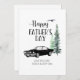 Una tarjeta del Día del Padre feliz con un diseño de coche vintage y árboles de pino. Tiene un espacio que se puede personalizar con nombres y un mensaje corto.