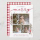 Comparte saludos navideños con estas tarjetas de Navidad con estilo rústico chic que presentan tres de tus fotos favoritas (1 paisaje, 2 cuadradas) rodeadas por un borde blanco delgado con ramas de acuarela pintadas, ramas, flores rojas y piñas asomándose en las esquinas. "So Very Merry" aparece en la parte superior en una elegante mezcla de letras de imprenta y de escritura. Personaliza con tu saludo navideño personalizado, nombre(s) y el año a lo largo de la parte inferior. Las tarjetas tienen un reverso con un patrón de cuadros rústicos de búfalo en rojo y blanco navideño a juego.