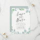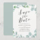 Tarjeta de compromiso moderna que muestra "Guardar la fecha" en una elegante tipografía gris oscura sobre fondo blanco. Una guirnalda de hojas de eucalipto al estilo acuarela en varios tonos de verde rodea la fecha de la boda, nombres de los contrayentes y ubicación. La tarjeta de compromiso con eucalipto tiene un reverso con fondo verde menta que incluye espacio para fotos y texto adicional.