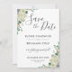 Esta elegante tarjeta de compromiso de boda cuenta con una hermosa disposición floral blanca y de follaje verde. Diseñada para coincidir con nuestra colección de bodas Dunwich. Personalízala con tus datos de manera fácil y rápida, simplemente presiona el botón personalizar para reorganizar y dar formato al estilo y ubicación del texto. (c) The Happy Cat Studio