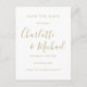 Con nombres de estilo de firma, esta elegante tarjeta de compromiso dorada y blanca se puede personalizar con los detalles de su día especial de boda en tipografía dorada chic. Diseñado por Thisisnotme©