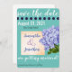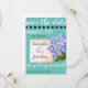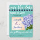 Personaliza esta tarjeta de compromiso con la fecha de tu boda, lugar y nombres de la novia y el novio. La tarjeta tiene un esquema de color azul turquesa, azul marino y púrpura con una hortensia.