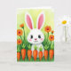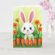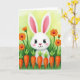Esta tarjeta presenta un conejo blanco estilizado que asoma desde un grueso parche de hierba verde esmeralda, con su cara y parte superior del cuerpo centrados como si se inclinara para un saludo amistoso 🐰. Delante, siete hortalizas naranjas prolijamente alineadas con copas verdes frondosas crean una hilera de jardín ordenada que se siente como un momento compartido entre el conejo y el espectador. Los grandes ojos azules del conejo, su pequeña nariz rosa y sus mejillas sonrosadas le dan una apariencia tierna y afectuosa, como si estuviera calladamente complacido de ver a alguien especial. Las orejas altas se elevan sobre su cabeza con detalles internos suaves rosados, agregando un toque suave y acogedor a la escena. El fondo se desvanece en un lavado verde pálido y soleado, manteniendo el enfoque en el conejo y el jardín mientras sugiere una mañana primaveral tranquila. Pequeñas flores cálidas-naranjas con pétalos en forma de estrella y centros rojos más profundos puntean el follaje, como notas alegres metidas en el paisaje 🌷. Cualquier texto de saludo se sentaría bien cerca de la parte superior en un tono pastel suave, con una línea más pequeña cerca de la parte