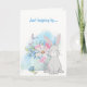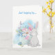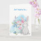 En la parte frontal de esta tarjeta de felicitación para todas las ocasiones hay una maceta llena de hermosas flores de primavera en tonos pastel de rosa, azul y verde. Al lado de la maceta con flores hay un adorable conejo, y una mariposa revolotea alrededor. El texto azul coincidente en la parte superior dice "Sólo pasando...". El interior de la tarjeta tiene otra imagen del conejo sentado entre flores azules, y el texto "...¡para decir HOLA!". Todo el texto se personaliza fácilmente a lo que desees, por lo que es fácil adaptar esta hermosa tarjeta a la Pascua, un cumpleaños o una tarjeta de "mejórate". ¡Haz que diga lo que quieras!