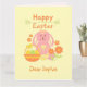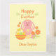 Tarjeta de conejo rosa y flores de Pascua feliz