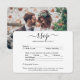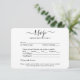 Comparta una de sus fotos de compromiso o boda con estas elegantes y versátiles tarjetas RSVP. La imagen y todo el texto son simples para el personalizar. (IMAGEN PLACEMENT TIP: Una manera fácil de centrar una foto exactamente como quieres es recortarla antes de subirla al sitio web de Zazzle.) La tarjeta incluye opciones de comida, alergias a alimentos, peticiones de canciones y opciones para responder en línea a través de un sitio web o una dirección de correo electrónico. Toda la información de respuesta se puede personalizar o eliminar. El diseño en blanco y negro presenta una tipografía minimalista moderna, caligrafía manuscrita y una fotografía de su elección. Esta tarjeta es una manera elegante de pedir a los invitados bodas que respondan amablemente a su próxima celebración del día especial.