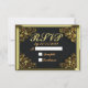 Regal decorado con texto dorado y floridas esquinas ornamentales tarjeta RSVP con fondo negro para un cumpleaños 25. Alternativamente, se puede usar para un aniversario.
