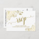 Estas hermosas tarjetas RSVP harán que sea más fácil para sus invitados responder a su invitación a la boda. Presentan un diseño elegante con caligrafía de escritura dorada sobre un fondo blanco, y rulos florales y remolinos dorados en las esquinas. La parte posterior de la tarjeta es un formulario que los clientes deben rellenar y devolver en el que se indica si pueden asistir o no, el número de clientes que traen y la elección de las comidas. También hay espacio para un sitio web para que sus huéspedes puedan responder en línea si les resulta más conveniente.