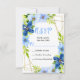 This fun and whimsical wedding rsvp enclosure card features watercolor baby blue and navy blue flowers with foliage on a gold geometric frame. The text combines handwritten script and serif fonts for a stylish and modern look. This is perfect for a spring or summer rustic wedding.