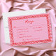 Esta tarjeta de respuesta de boda de foto caprichosa con opciones de cena presenta un marco de rectángulo festoneado rojo y juguetón contra un divertido fondo a rayas rosas y rojas. Tus iniciales toman el centro del escenario en la parte posterior. Perfecto para una boda con estética preppy o de San Valentín, este diseño encantador proporciona un aspecto dulce y pintado a mano para tu celebración especial. Creado por Simply Farmhouse Press.