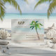 Esta tarjeta tropical RSVP incluye una playa de color agua y un paisaje de palmeras en tonos turquesa, azul acuático y oro. El reverso es una textura de mármol pintada en tonos azul océano-agua. Perfecto para los temas de playa, costa, destino y bodas isleños. Material gráfico original KL Stock