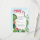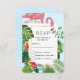 Tarjeta RSVP con un flamingo rosa lindo y caprichoso. Rodeado de hojas tropicales verdes y flores de hibisco rojas y amarillas. Marco de gradiente de oro cuadrado en el centro.