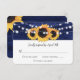 Tarjeta RSVP de boda floral de color azul marino con flores de girasol y luces de cuerda sobre un fondo rústico de madera. Diseño perfecto de tarjetas para complementar tu rústico campo azul marino, o fiesta de bodas en granero inspirada en flores de girasol.