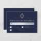 Esta tarjeta RSVP de boda, de color azul marino y plateado, con un aire vintage, tiene en la parte superior un escudo de Relieve metalizado falso de plata con un monograma, de 2 iniciales separadas por una línea. El fondo es azul marino. Todo el texto tiene un color gris claro similar al escudo plateado falso, excepto el M, que es azul marino. El lugar para el nombre y las casillas son de falso Relieve metalizado plateado y tienen esquinas redondeadas. En la parte posterior hay el mismo escudo de cosecha con monograma. El escudo floral vintage proviene de una antigua portada de libros, de "Rust, Smut Mildew & Mold", de 1870, ahora de dominio público.