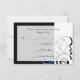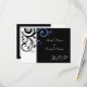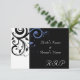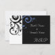Tarjetas de invitación de boda negras modernas contemporáneas y llamativas con acentos azules de aciano y vincapervinca blanca, con delicado fondo de hoja de voluta en espiral. Personalice en línea con los detalles de su boda.