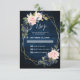 Tarjeta de respuesta de boda floral geométrica azul marino oscuro con un ramo elegante de azul marino, azul real, blanco, rosa rosado y hojas de eucalipto verde salvia y marco geométrico neutro con brillo elegante. Por favor, contácteme para cualquier ayuda en personalización o si necesita algún otro producto con este diseño.