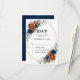 Tarjeta de confirmación de asistencia de boda con tema floral elegante de azul marino, terracota y naranja terroso con un ramo elegante de rosas peonías de color azul marino y terracota y hojas de eucalipto verdes. Por favor, contácteme para cualquier ayuda en personalización o si necesita algún otro producto con este diseño.