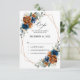 Elegante tarjeta de confirmación de asistencia de boda con tema floral terroso en azul marino, terracota y naranja, que presenta un elegante ramo de rosas peonías de color azul marino y terracota y hojas de eucalipto verdes. Por favor, contácteme para cualquier ayuda en personalización o si necesita algún otro producto con este diseño.