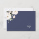 Sencillas y delicadas rosas blancas en la esquina superior izquierda de esta elegante tarjeta de respuesta púrpura, detalles de personalización en tipografía gris. La parte posterior de la tarjeta rsvp presenta la misma disposición floral, además de la tipografía de personalizable rsvp.