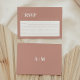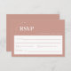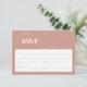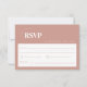 Una moderna y polvorienta tarjeta RSVP de boda rosa, diseñada con tipografía moderna, grabado en arco, y un lugar para los nombres de los huéspedes y las restricciones dietéticas.