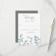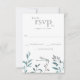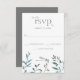Esta tarjeta de confirmación de asistencia de boda simple y moderna presenta una libélula/dragón de acuarela en tonos azules y verdes con alas iridiscentes. Está descansando sobre un arreglo simple de vegetación de jardín de acuarela natural en tonos verdes, azules, grises y marrones con fondo blanco. La parte posterior es de un gris sólido que coincide con el texto.