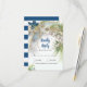 Tarjeta de recinto RSVP con temática de playa, con un follaje tropical de palma, un cartel de playa de madera, hermosas conchas y peces estrella azul y blanco acuáticos. La plantilla de respuesta dudosa está detallada con acentos azules del océano y es fácil de personalizar.