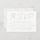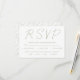 Esta tarjeta de respuesta RSVP de boda contemporánea ofrece un diseño elegante y minimalista con un toque de sofisticación. La adición de la palabra 'RSVP' en caligrafía de escritura verde salada da un toque moderno a la paleta monocromática. La parte posterior de la tarjeta muestra un patrón repetido del mismo texto verde sabio, uniendo el diseño a la perfección. Las opciones de personalización están disponibles para ajustar el tamaño del texto de modo que se puedan incluir nombres más largos o más cortos, lo que garantiza un ajuste perfecto.