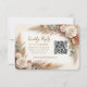 Simplify guest management with this elegant QR code design, featuring watercolor pampas grass, desert botanicals, and sophisticated terracotta tones.This composition displays professional design expertise through a balanced asymmetrical layout. The visual focus is a high-contrast QR element, expertly integrated alongside soft watercolor illustrations of dried palm fans, pampas plumes, and muted eucalyptus. The typography strategy pairs a fluid, artistic calligraphy headline with a clean, high-legibility serif for essential details, ensuring a layout that is both aesthetically pleasing and accessible for screen-reading software.This is a flat printed image with a Faux Gold Foil effect, not actual raised material.