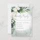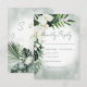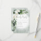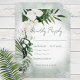 Este diseño de tarjeta de respuesta boda presenta una hermosa vegetación tropical exuberante y flores blancas sobre un suave fondo de color verde. Perfecto para el destino o la boda en la playa. Creado por Simply Farmhouse Press.