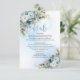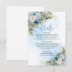 Boho wedding details card with dusty blue flowers, gold frame and elegant watercolor design.