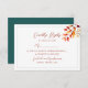 Elegante y de temporada, esta verde azulada y naranja tarjeta RSVP de casamiento presenta un follaje acuático de otoño y un diseño sencillo y clásico para recoger respuestas de los huéspedes. Con un espacio para las preferencias de las comidas y un retorno por fecha, es perfecto para coordinarse con tu suite boda con temática otoñal. Personalizable completo para coincidir con los detalles del evento y el estilo personal.