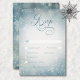 Anuncie a su boda invernal de maravillosa tierra con un toque de etérea elegancia. Nuestra encantadora tarjeta de respuesta boda con opciones para cenar tiene un suave y soñador fondo que recuerda a un cielo invernal crepúsculo. Los tonos azul turbio se mezclan perfectamente con delicados acentos blancos, creando un lienzo para copos de nieve que caen suavemente. Este paisaje sereno se basa en un cautivador desenfoque oval blanco, que le da cabida a los detalles bodas en un abrazo romántico. El texto, una bella combinación de guion fluido y serif vintage en un azul intenso y polvoriento, destaca con elegante claridad. Una simple capa de espuma da el efecto de la nieve brillante. Esta encantadora suite capta la belleza de una nevada de invierno, y ofrece un escenario perfecto para que tu historia de amor florezca en medio de la magia de la temporada. Creado por Simply Farmhouse Press.