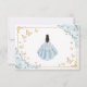 Baby blue, gold and white Quinceanera RSVP reply card. Features brunette girl in ball gown dress, script font, gold butterflies, roses and tiara. Perfect for an elegant princess style glam celebration. Personalize with your own details.