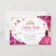 Fuchsia pink, gold and white Quinceanera RSVP reply card. Features brunette girl in ball gown dress, script font, gold butterflies, hot pink roses and tiara. Perfect for an elegant princess style glam celebration. Personalize with your own details.