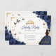 Navy, gold and white Quinceanera RSVP reply card. Features brunette girl in ball gown dress, script font, gold butterflies, navy blue roses and tiara. Perfect for an elegant princess style glam celebration. Personalize with your own details.