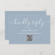 Un sencillo y elegante script de firma responde amablemente a la polvorienta tarjeta RSVP azul con código QR. Diseñado por Thisisnotme©