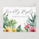 Una elegante tarjeta de confirmación de asistencia con flores tropicales en acuarela y vegetación con tipografía elegante. El reverso incluye sus datos y una divertida solicitud de canción para invitados. Diseñada por Thisisnotme
